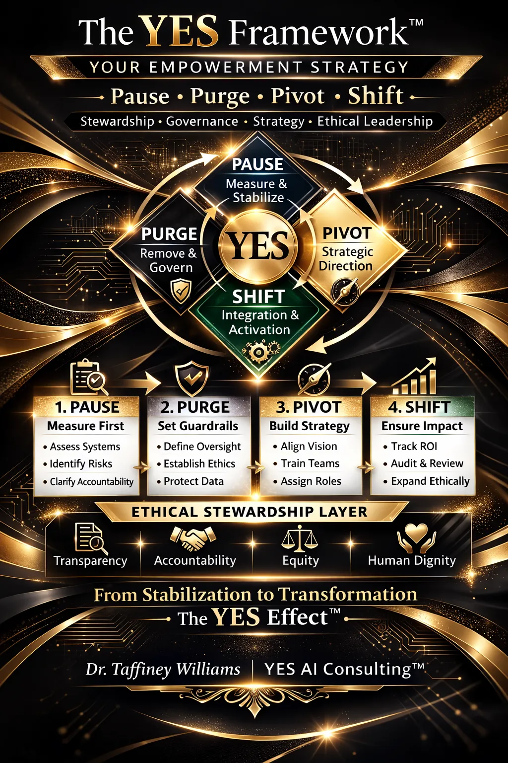 At the center of Dr. Taffiney Williams’ work is the YES Framework: Pause, Purge, Pivot, and Shift.